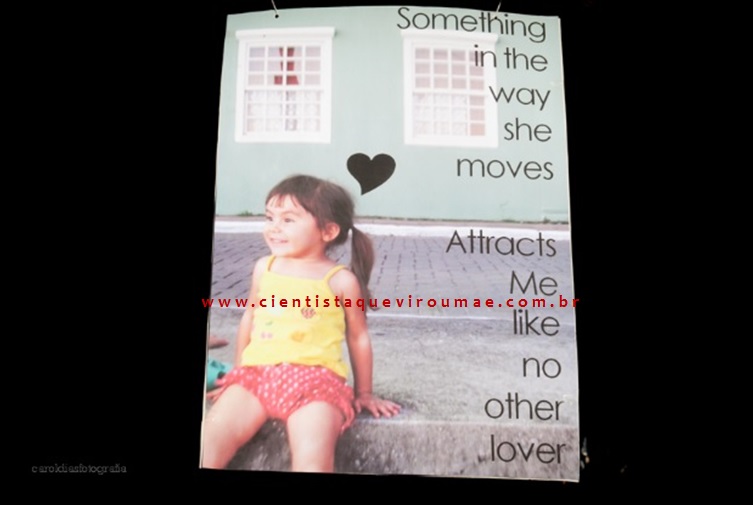 Foi pelas imagens que organizei no Pinterest que decidi: a decoração geral ficaria por conta de cartazes grandes, cuja arte eu mesma faria, inspirada em letras de músicas, com fotos dela e trechos dos Beatles que dizem aquilo que sinto por ela (o que foi fácil, porque depois de yeah, yeah, yeah, o que eles mais falam é de amor). E surgiram diferentes cartazes, com diferentes fotos e letras de músicas, alguns inspirados em imagens que fui encontrando e outros criados por mim. Mandei imprimir em gráfica, em diferentes tamanhos, papel couchê 300 g, colados sobre papel paraná para ficarem rígidos. Eles foram pendurados com barbante em lugares diferentes da casa. Gastei pouco, porque imprimir em gráfica fica barato, é cerca de R$ 4,00 a R$ 6,00 cada folha, e dependendo do tamanho da ampliação dá pra fazer mais de um por folha. Fui fazendo e ampliando aos poucos, conforme vinha a criatividade. Nas mesas, toalhas coloridas que mandei fazer para a festinha do primeiro ano (costuradas por uma amiga), que guardei e uso sempre, com garrafinhas cheias de pedrinhas amarelas (tudo usado no ano anterior e guardado) e com enfeite de papel cuja arte eu também fiz com imagens garimpadas, mandei imprimir e colei num palito de churrasco.