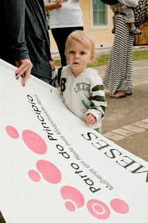 O filho foi ajudar a mãe, Regiane, a dizer: “PARTO HUMANIZADO PARA UM MUNDO MAIS HUMANO”. E olha quem está ali ao lado, slingando e militando e seguindo a canção… 🙂