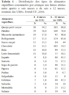 “Observa-se que nas duas faixas etárias o consumo de queijo petit-suisse foi o mais frequente (34,2% entre as crianças de quatro a seis meses e 96,8% entre as crianças de idade superior a seis meses); e em segundo lugar apareceu o pirulito, com 26% e 78,8%, respectivamente. O refrigerante também é consumido em larga escala (classificado em 4º lugar entre as crianças de quatro a seis meses e em 3º lugar nas de idade superior a seis meses). As crianças de quatro a seis meses não consomem mortadela e salame, mas após os seis meses de idade estes alimentos já são oferecidos.”