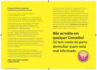 Compartilho também um dos folders, frente e verso, que será distribuído na marcha em algumas cidades. Clique, abra e leia seu conteúdo. Ali está explicado o que queremos. O que é o parto domiciliar. Quais são as evidências científicas que atestam sua segurança. Onde se pode buscar mais informação a respeito.